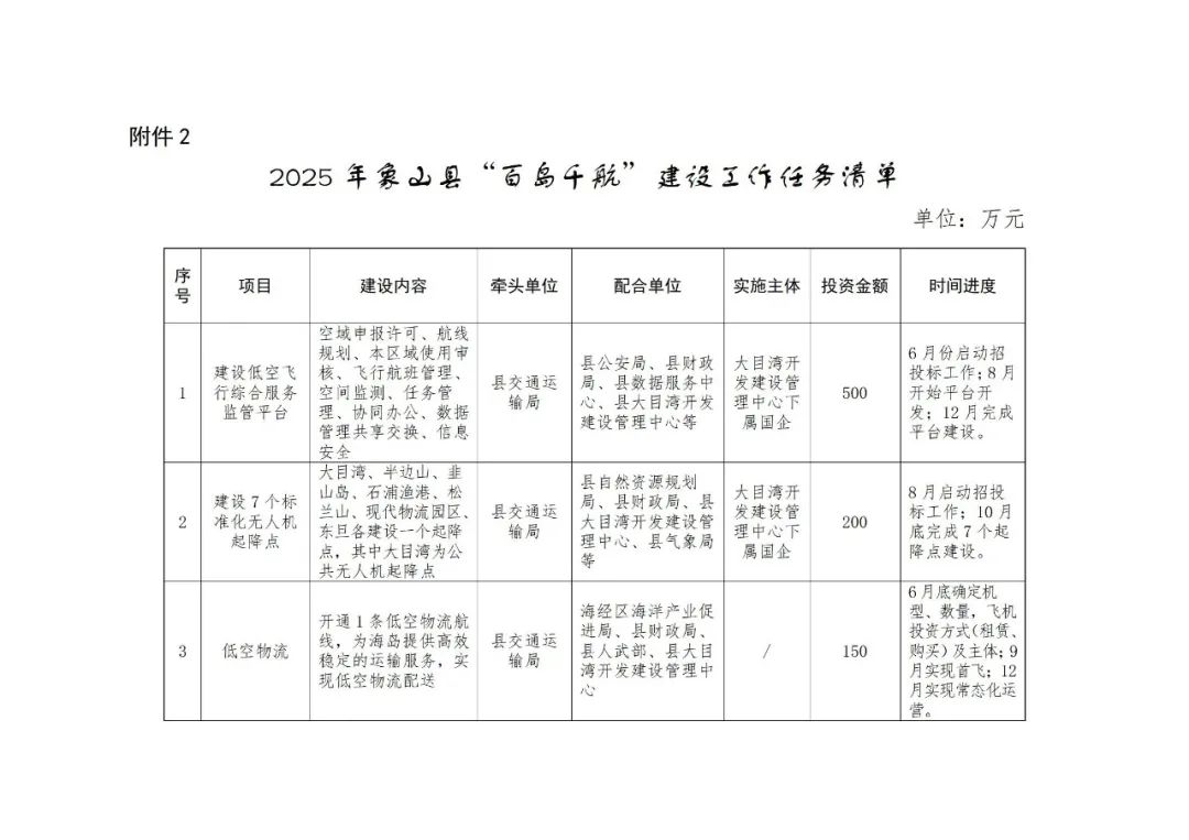 2.统筹建设起降点及配套设施。综合考虑现实需求、发展趋势、成本效益等,结合土地、环境、气象等条件,统筹规划建设适应低空飞行器起降、备降、停放、充电、运输及运营等需求的起降场,并配备相应信号基站,形成城区停机坪、海岛乡镇起降点、应急备降场三级节点。(县交通运输局牵头,县自然资源规划局、县经信局、县大目湾开发建设管理中心、县气象局等单位配合)