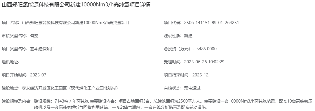 氢能汇获悉,6月26日,山西郑旺氢能源科技有限公司新建10000Nm³/h高纯氢项目备案预审通过。