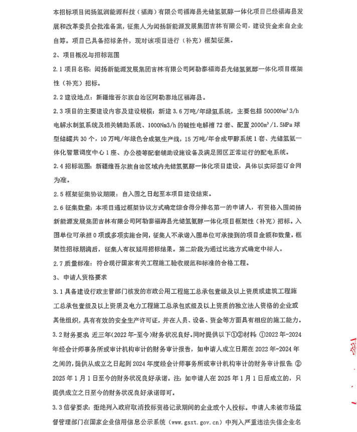氢能汇获悉,7月2日,闳扬新能源发展集团吉林有限公司阿勒泰福海县光储氢氨醇一体化项目框架性(补充)招标征集公告。