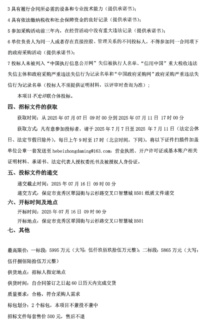 根据招标公告,本招标项目划分为2个标段,本次招标为其中的:(001)保定市农业发展集团有限公司氢能车辆购置项目一标段;(002)保定市农业发展集团有限公司氢能车辆购置项目二标段。