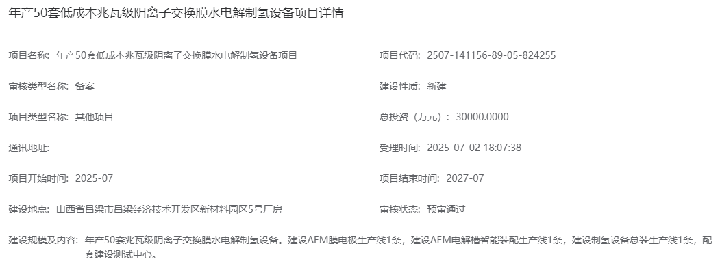 根据项目详情,年产50套低成本兆瓦级阴离子交换膜水电解制氢设备项目建设地点在山西省吕梁市吕梁经济技术开发区新材料园区5号厂房,总投资30000万元。
