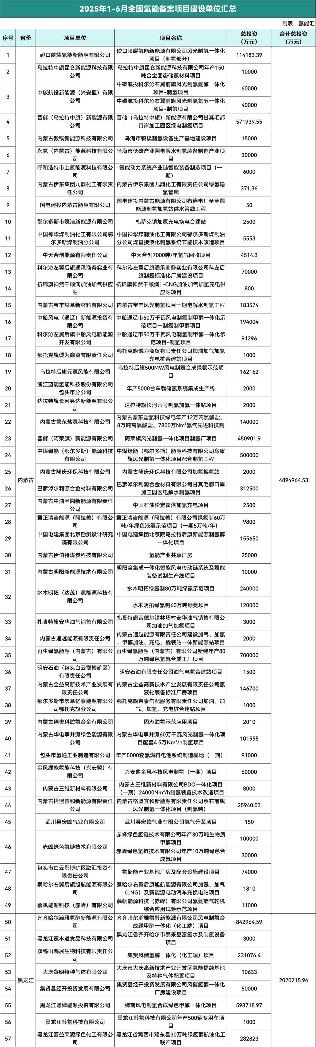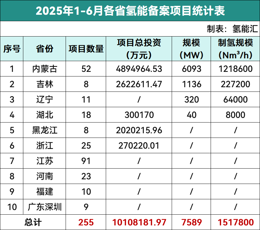 氢能汇根据公开信息不完全统计,2025年1-6月全国各省完成备案的氢能项目共计255个,投资总计10108181.97万元(约1010.81亿元),规模总计7589MW,制氢规模总计1517800Nm³/h。