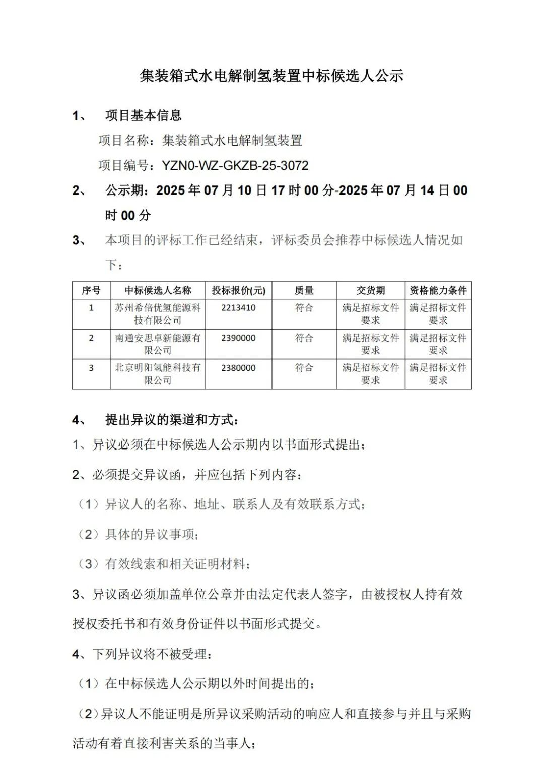 氢能汇获悉,7月10日,集装箱式水电解制氢装置中标候选人公示。