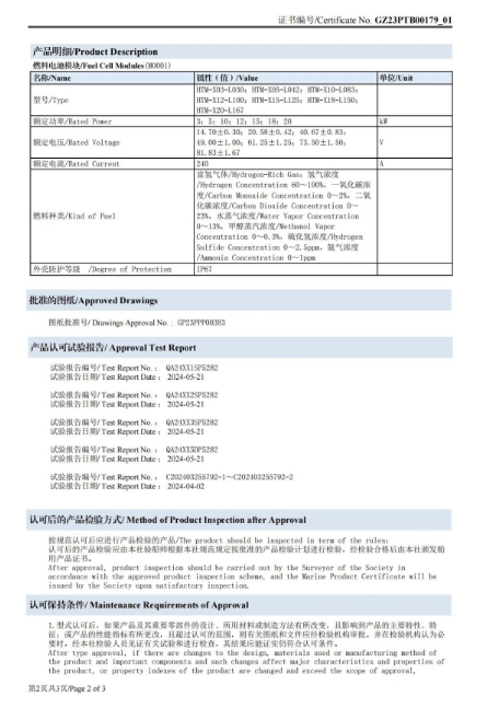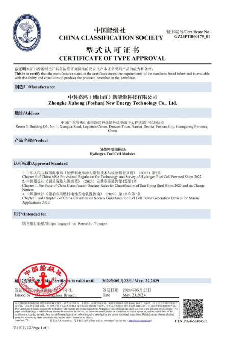 据新能源圈了解到,2024年5月23日,中科嘉鸿高温质子交换膜燃料电池模块获得中国船级社认证。