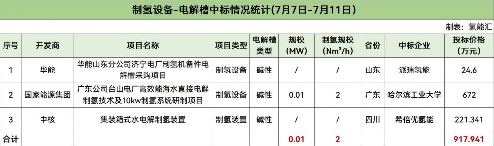 据氢能汇统计,本周3个电解槽项目开标,规模为0.01MW,制氢规模总计2Nm³/h,投标报价总计917.941万元。