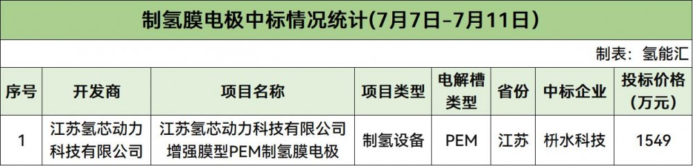 本周制氢膜电极中标项目有1家,招标人是江苏氢芯动力科技有限公司,中标企业为枡水科技。