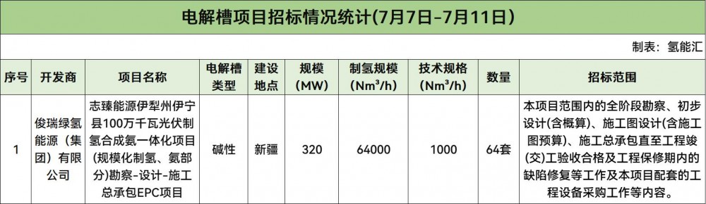 招标项目方面,其中,电解槽招标项目1个,规模为320MW,制氢规模总计64000Nm³/h。其他类型氢能招标项目6个。