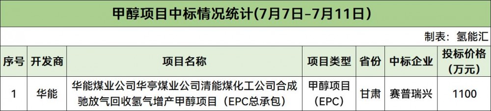 本周甲醇项目中标项目有1家,招标人是华能,中标企业为赛普瑞兴。