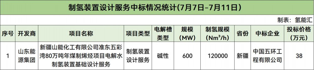 本周制氢装置设计服务中标项目有1家,招标人是山东能源集团,中标企业为中国五环工程有限公司。