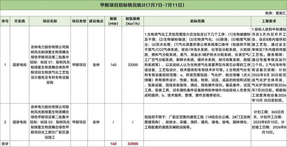 吉林电力股份有限公司梨树风光制绿氢生物质耦合绿色甲醇项目第二批集中招标,标段01:梨树风光制绿氢生物质耦合绿色甲醇项目生物质气化工艺包设计服务及专利专有设备采购,本项目采用“新能源电解水制绿氢”耦合“生物质气化制合成气”技术,经净化、甲醇合成等工艺,建设年产19.7万吨精甲醇,气化装置设置单系列,净化装置及甲醇装置均为单系列。电解水装置制氢规模为3.2万Nm³/h,平均供氢量1.36万Nm³/h。本项目生产装置有空分装置、生物碳装置、生物质气化装置、气体净化装置、电解水制氢装置、甲醇装置。公用及辅助工程有给水及消防水站、循环冷却水站、泡沫消防站、除盐水站、回用水站、蒸发结晶、污水处理站、事故水池、余热发电、动力站、空压站、换热站、甲醇罐区、氢气罐区、装车栈台、固体贮运设施、火炬、全厂供配电设施、全厂控制系统、全厂给排水管网、全厂外管、全厂通信、全厂通讯、及总图运输等。项目整体进度:现场开工日期2025年9月10日,计划完工并产出合格甲醇日期2027年6月30日。