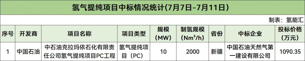 本周氢气提纯中标项目有1家,招标人是中国石油,中标企业为中国石油天然气第一建设有限公司。