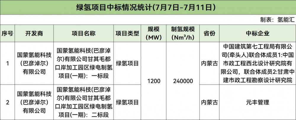 本周绿氢中标项目有2家,招标人是国蒙氢能科技(巴彦淖尔)有限公司,中标企业为中国建筑第七工程局有限公司(牵头人)联合体成员1:中国市政工程西北设计研究院有限公司,联合体成员2:甘肃中建市政工程勘察设计研究院;元丰管理。