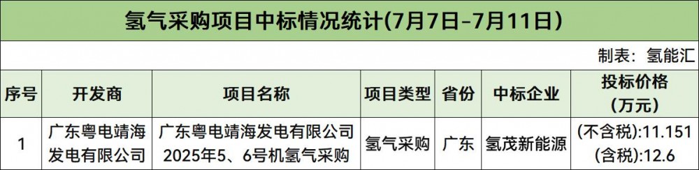 据氢能汇统计,本周1个氢气采购项目开标,该项目为广东粤电靖海发电有限公司2025年5、6号机氢气采购,由氢茂新能源中标,投标报价为11.151万元(不含税)/12.6万元(含税)。