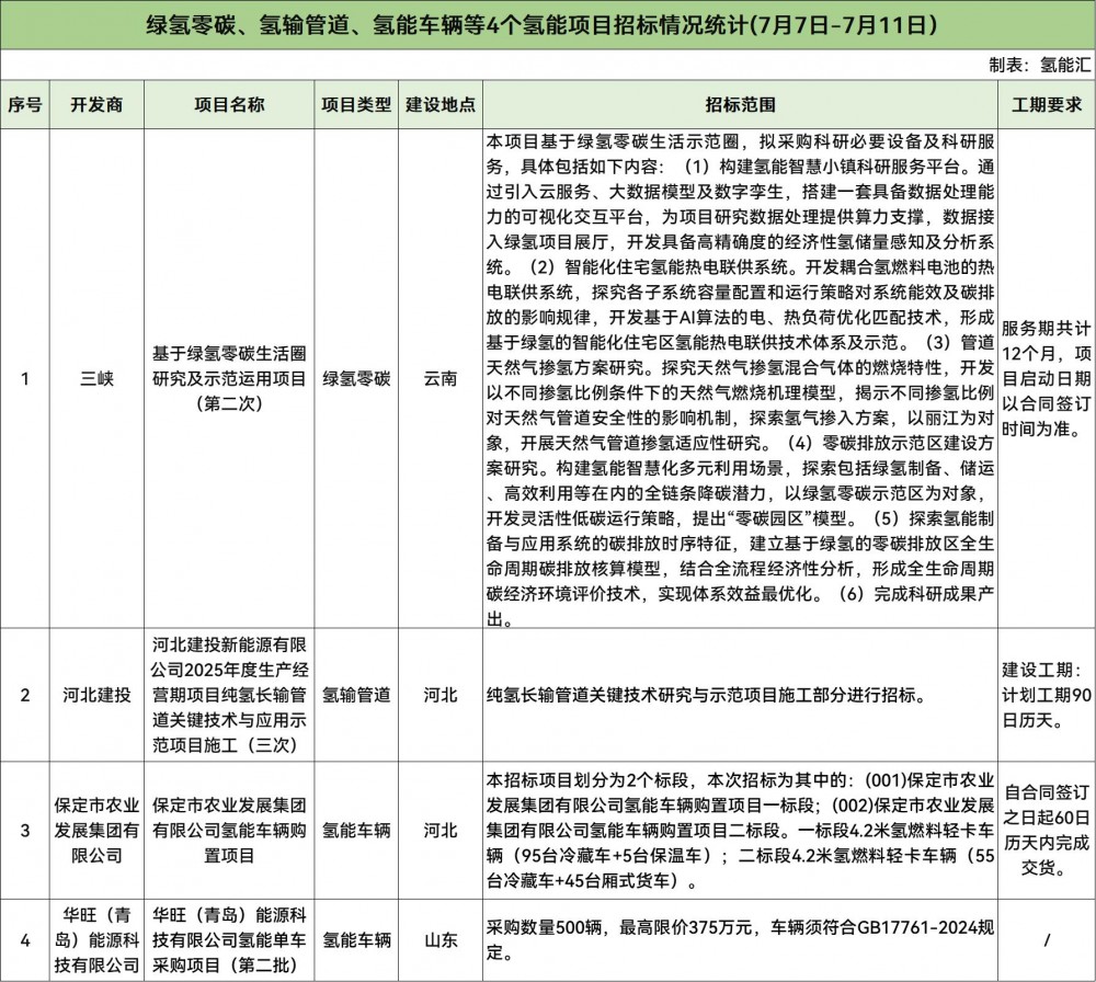 据氢能汇统计,本周绿氢零碳、氢输管道、氢能车辆等招标市场方面,共4个项目启动采购,招标人分别是三峡、河北建投、保定市农业发展集团有限公司、华旺(青岛)能源科技有限公司。