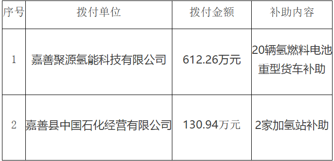 其中,20辆氢燃料电池重型货车补助拨付单位为嘉善聚源氢能科技有限公司,拨付金额612.26万元。