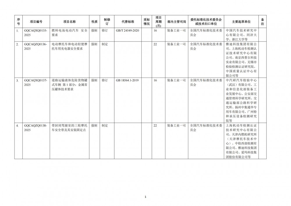 根据标准化工作的总体安排,现将申请立项的《燃料电池电动汽车 安全要求》等4项强制性国家标准计划项目予以公示(见附件1)。