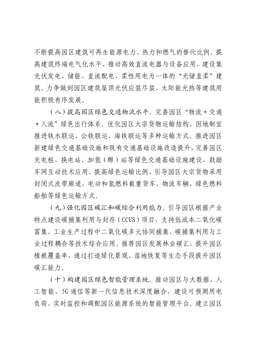 推进园区新建绿色交通基础设施和既有交通基础设施改造提升,完善园区充电桩、换电站、加氢(醇)站等绿色交通基础设施建设,鼓励车网互动技术应用。提高绿色运输比例,引导园区大宗货物采用封闭式皮带廊道,电动和氢燃料载重货车、物流车辆,绿色燃料船舶等绿色运输方式。