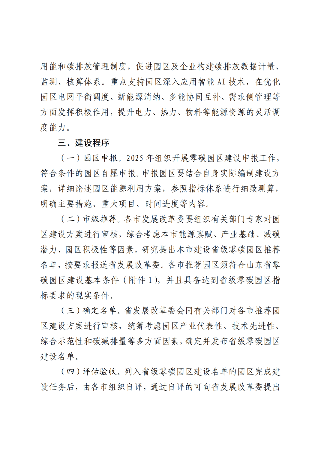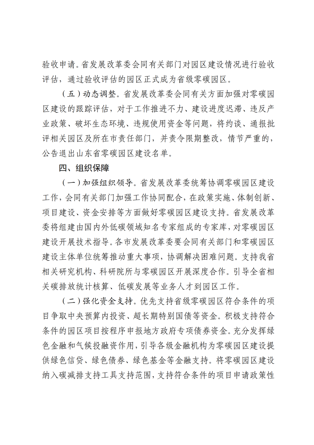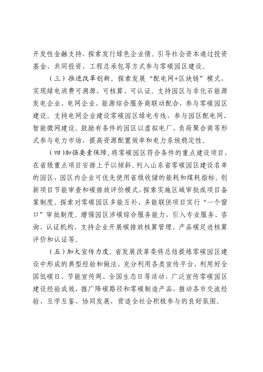 现将《山东省零碳园区建设方案》印发给你们,请认真组织实施,合力推进我省零碳园区建设工作。省发展改革委负责统筹推进零碳园区建设,持续深化相关领域改革创新,在试点探索、项目建设、资金安排等方面对零碳园区建设给予积极支持。省工业和信息化厅负责指导各市推进工业园区低碳化改造,推动具备条件的工业园区建设零碳园区。省能源局负责指导各市加强零碳园区绿色能源供给体系建设和改革创新,推动园区供用能模式变革。各市发展改革委要会同工业和信息化、能源主管等部门结合实际抓好工作落实。