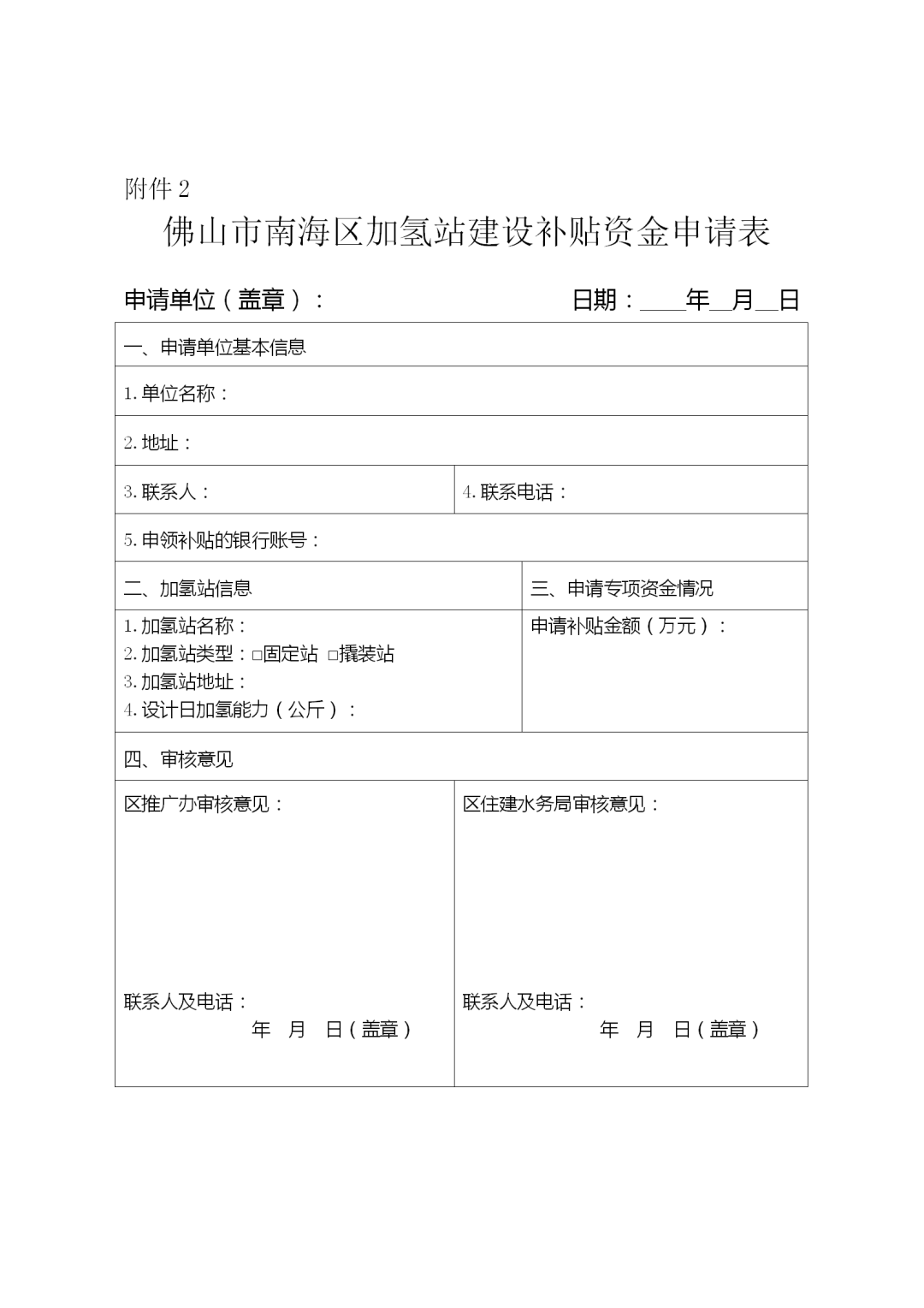 (一)佛山市南海区加氢站建设补贴资金申请表(附件2);