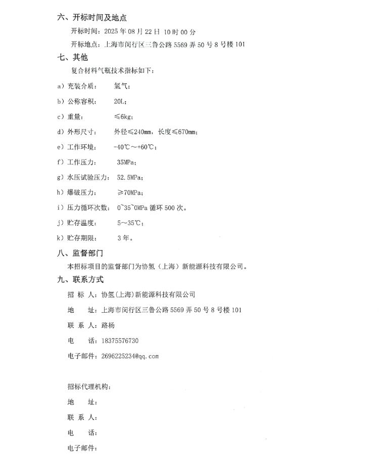 2024-04-30 氢能汇获悉,7月22日,协氢300只氢能无人机气瓶招标公告。