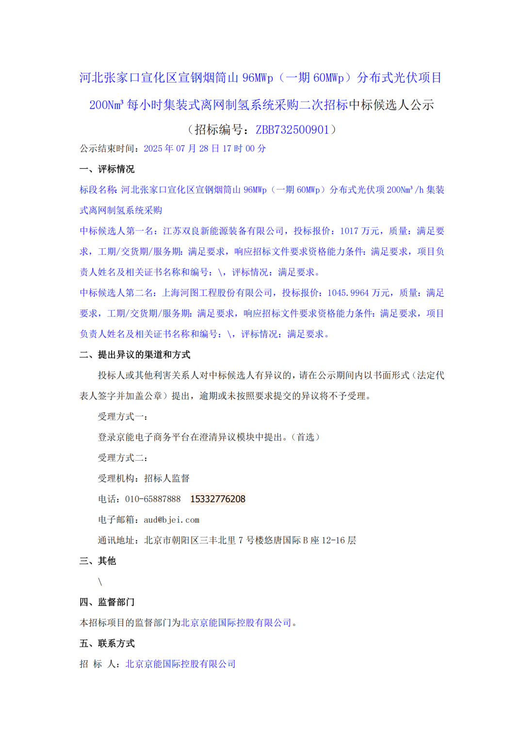 氢能汇获悉,7月24日,河北张家口宣化区宣钢烟筒山96MWp(一期60MWp)分布式光伏项目200Nm³每小时集装式离网制氢系统采购二次招标中标候选人公示。