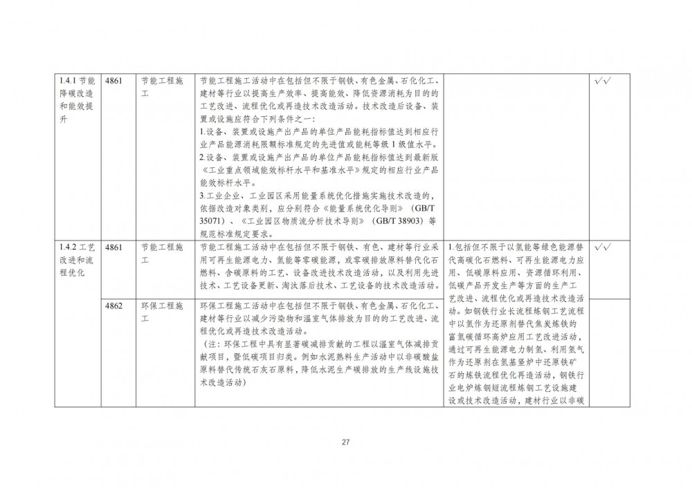 节能工程施工活动中在包括但不限于钢铁、有色、建材等 行业采用可再生能源电力、氢能等零碳能源,或零碳排放 原料替代化石燃料、含碳原料的工艺、设备改进技术改造 活动,以及利用先进技术、工艺设备更新、淘汰落后技术 、工艺设备的技术改造活动。