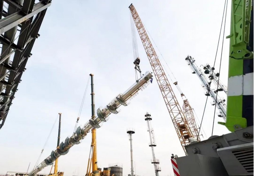 2025年3月,项目低温甲醇洗装置吸收塔成功吊装就位。由于厂区布局紧凑,吊装施工区域有限,为了顺利完成高74米、起吊重量182吨的吸收塔吊装作业,项目团队反复模拟,最终采用三机抬吊的施工方案,在700吨履带式起重机主吊、600吨、300吨两台汽车吊的高效协同作业下,顺利实现“塔起灯亮”吊装就位。标志着项目大型设备吊装任务全部完成,正式进入设备安装与调试阶段。