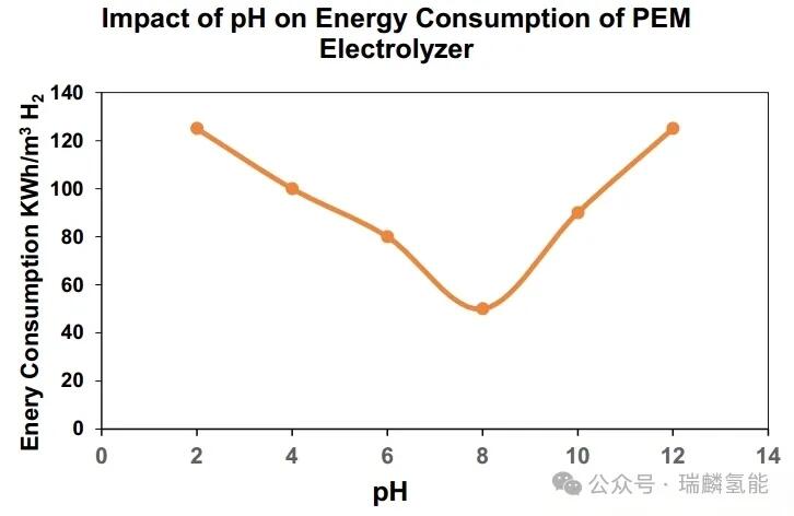 pH值还直接影响能耗。在PEM电解槽中,最佳pH范围通常在7-9之间,因为pH值影响电解液电导率:pH过高可能损伤膜结构,导致能耗上升;pH过低则降低导电性,并引发膜干涸问题,从而增加能耗。实验数据表明,pH为8时能耗最低(约45kWh/m? H?),偏离此值能耗均上升。