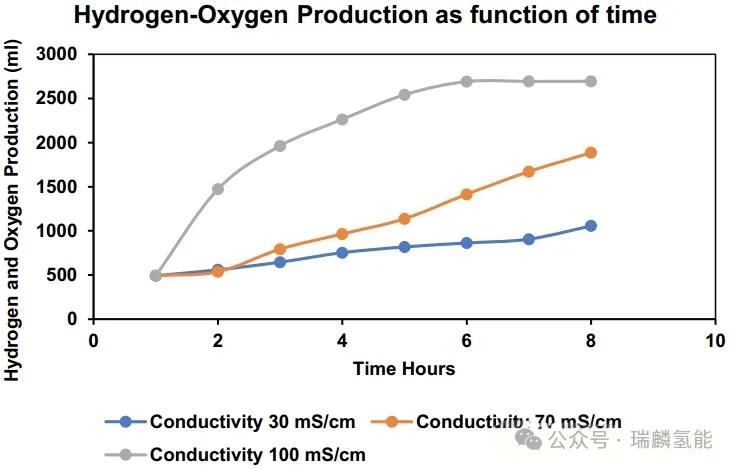 电导率是另一个重要参数,反映水中离子浓度。高电导率可降低阳极氧还原反应(OER)的过电位,减少能源需求,但过高值会增加膜恶化风险和泵送能耗。实验在电导率30mS/cm、70mS/cm和100mS/cm下进行,结果与多项研究相符:电导率上升促进氢气产量。