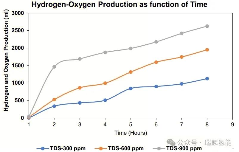 TDS指水中溶解的无机和有机物总浓度,是评估水质的关键指标。实验测试了低(300ppm)、中(600ppm)和高(900ppm)三个TDS水平,结果显示产气量随TDS浓度增加而上升,高TDS可能充当催化剂促进氢气形成。相反,低TDS水平产气量有限,TDS为零时无氢气产出,这与现有研究一致。