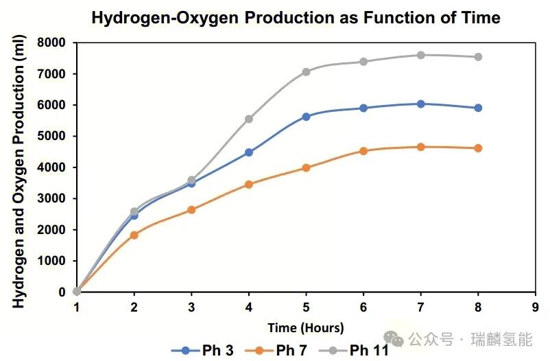 pH值是影响氢气生产效率的核心因素。随着pH值变化,氢气和氧气的生成速率会相应波动。实验结果显示,当pH值从3升至7时,产气量下降,表明中性环境可能减缓电解过程;但pH值升至11时,产气量显著增加,提示碱性条件有利于氢气生成。