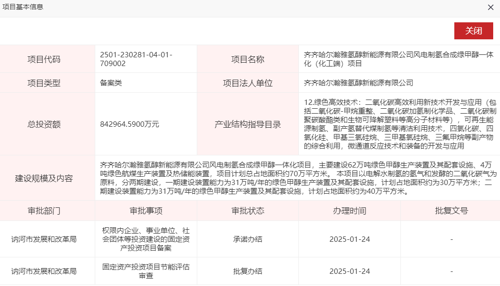 据悉,1月24日,齐齐哈尔瀚雅氢醇新能源有限公司风电制氢合成绿甲醇一体化(化工端)项目获备案,总投资额842964.59万元,项目单位为齐齐哈尔瀚雅氢醇新能源有限公司。