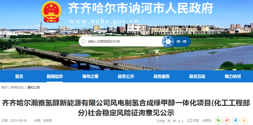 新能源圈获悉,8月6日,齐齐哈尔市讷河市人民政府发布《齐齐哈尔瀚雅氢醇新能源有限公司风电制氢合成绿甲醇一体化项目(化工工程部分)社会稳定风险征询意见公示》。