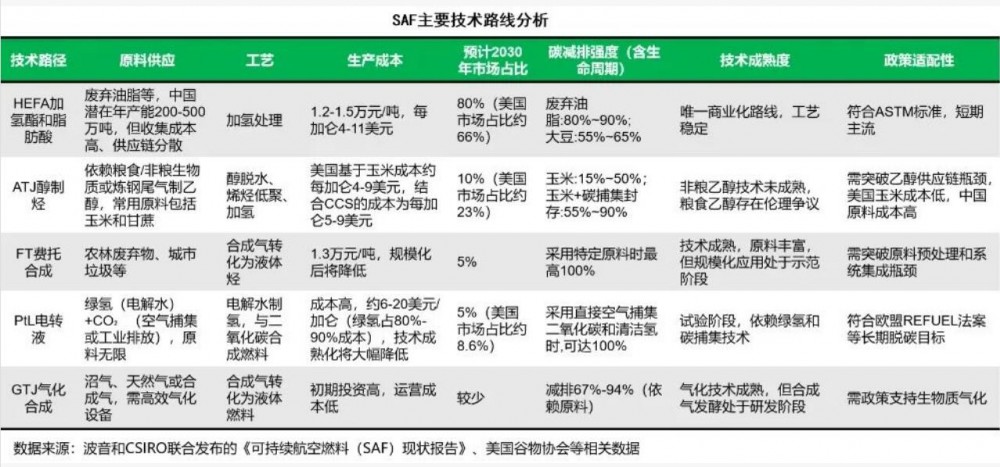 目前加氢酯和脂肪酸(HEFA)路线是商业化程度最高,约占98%产能,但原料依赖废弃食用油等有限资源,可能在2030年后引发供应缺口。生物质气化+费托合成(G+FT)、电转液(PtL)等技术路线有望在未来发挥更重要的作用。