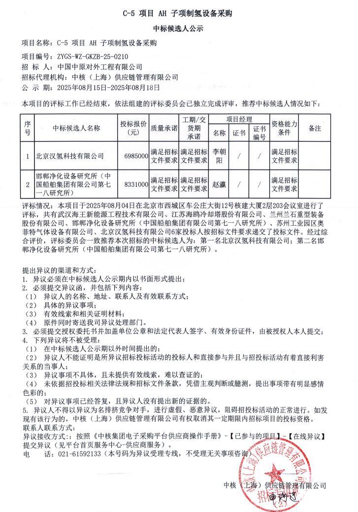 8月19日,C-5项目AH子项制氢设备采购中标结果公告。