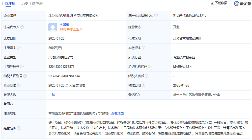 江苏氢湾华创能源科技发展有限公司成立于2025年01月26日,注册资本800万元,注册地位于常州西太湖科技产业园长塘路88号2号楼1楼,法定代表人为王铭东。经营范围包括许可项目:技术服务、技术开发、技术咨询、技术交流、技术转让、技术推广;工程和技术研究和试验发展;专业设计服务;工业设计服务;软件开发;计算机系统服务;会议及展览服务;项目策划与公关服务;创业空间服务;物业管理;财务咨询等。