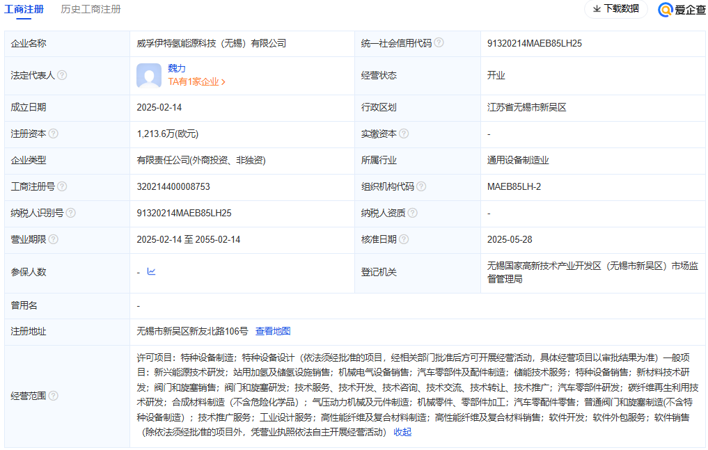 威孚伊特氢能源科技(无锡)有限公司成立于2025年02月14日,注册资本:1213.6万欧元,注册地位于无锡市新吴区新友北路106号,法定代表人为魏力。经营范围包括:新兴能源技术研发;站用加氢及储氢设施销售;机械电气设备销售;汽车零部件及配件制造;储能技术服务;新材料技术研发;汽车零部件研发;碳纤维再生利用技术研发等。