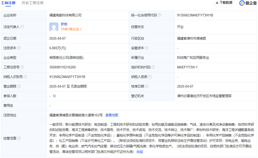 福建海氢科技有限公司成立于2025年04月07日,注册资本6800万元,注册地位于福建省漳浦县古雷镇疏港大道南102号,法定代表人为罗竞。经营范围包括:新兴能源技术研发;站用加氢及储氢设施销售;气体、液体分离及纯净设备销售;新材料技术研发;海洋工程关键配套系统开发;发电业务、输电业务、供(配)电业务;燃气汽车加气经营;移动式压力容器/气瓶充装;新化学物质生产等。