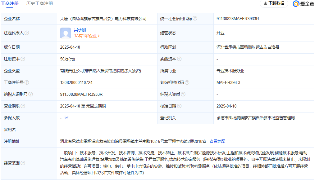 大唐(围场满族蒙古族自治县)电力科技有限公司成立于2025年04月10日,注册资本50万元,注册地位于河北省承德市围场满族蒙古族自治县围场镇木兰南路102-5号塞罕坝生态馆2楼2018室,法定代表人为吴永刚。经营范围包括:新兴能源技术研发;工程和技术研究和试验发展;储能技术服务;电动汽车充电基础设施运营;站用加氢及储氢设施销售;输电、供电、受电电力设施的安装、维修和试验等。