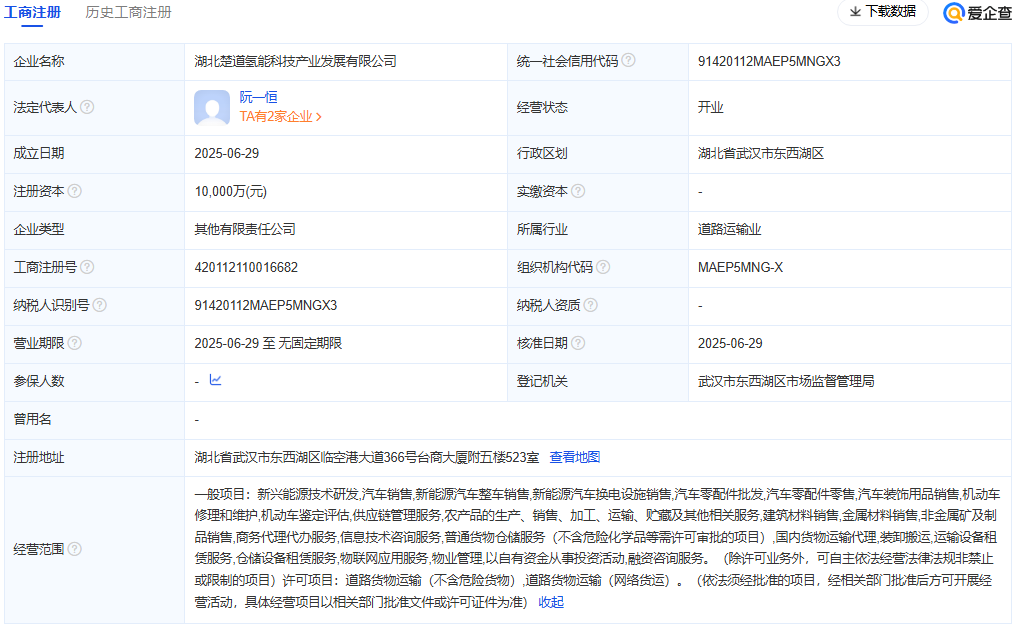 湖北楚道氢能科技产业发展有限公司成立于2025年06月29日,注册资本10000万元,注册地位于湖北省武汉市东西湖区临空港大道366号台商大厦附五楼523室,法定代表人为阮一恒。经营范围包括:新兴能源技术研发,汽车销售,新能源汽车整车销售,新能源汽车换电设施销售,汽车零配件批发,汽车零配件零售,汽车装饰用品销售,机动车修理和维护,机动车鉴定评估,供应链管理服务。