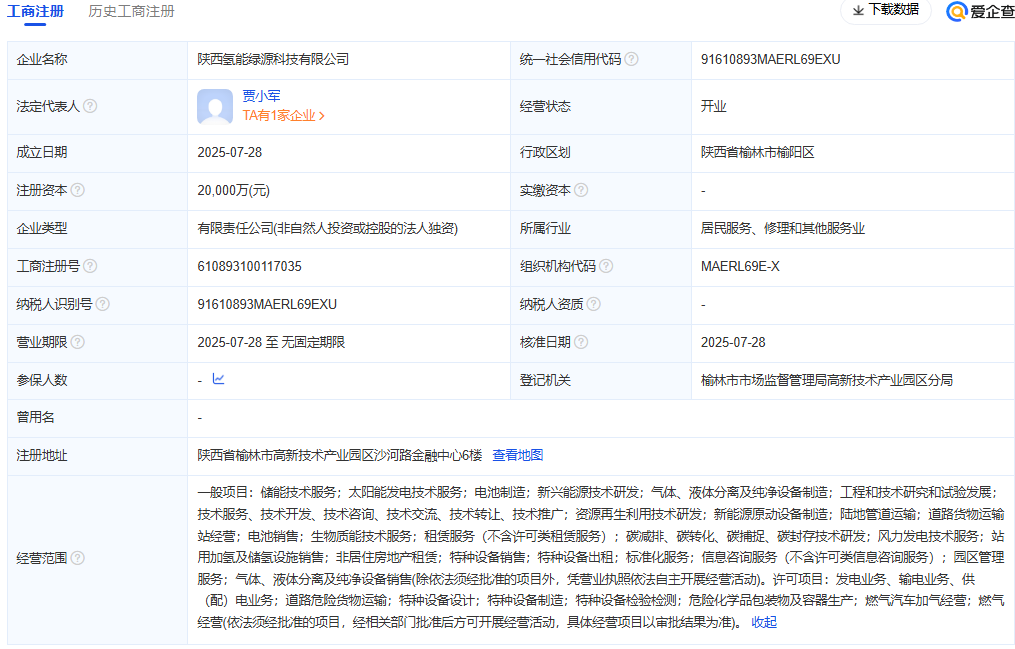 陕西氢能绿源科技有限公司成立于2025年07月28日,注册资本20000万元,注册地位于陕西省榆林市高新技术产业园区沙河路金融中心6楼,法定代表人为贾小军。经营范围包括一般项目:储能技术服务;太阳能发电技术服务;电池制造;新兴能源技术研发;新能源原动设备制造;陆地管道运输;碳减排、碳转化、碳捕捉、碳封存技术研发;风力发电技术服务;站用加氢及储氢设施销售等。