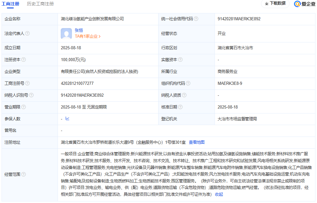 湖北绿冶氢能产业创新发展有限公司成立于2025年08月18日,注册资本100000万元,注册地位于湖北省黄石市大冶市罗桥街道长乐大道9号(金融服务中心)1号楼301室,法定代表人为张恒。经营范围包括一般项目:新兴能源技术研发;站用加氢及储氢设施销售;储能技术服务;风电场相关系统研发;新能源原动设备制造;充电桩销售;光伏设备及元器件销售;新能源汽车整车销售;新能源汽车电附件销售;新能源汽车换电设施销售;太阳能发电技术服务;风力发电技术服务;电动汽车充电基础设施运营等。