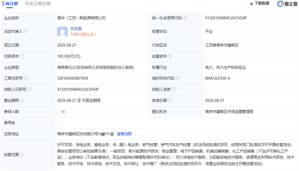 国华(江苏)新能源有限公司成立于2025年08月21日,注册资本100000万元,注册地位于南京市建邺区科技路33号1幢611室,法定代表人为苏志国。经营范围包括:发电业务、输电业务、供(配)电业务;燃气经营;燃气汽车加气经营;新兴能源技术研发;风力发电技术服务;太阳能发电技术服务;资源再生利用技术研发等。