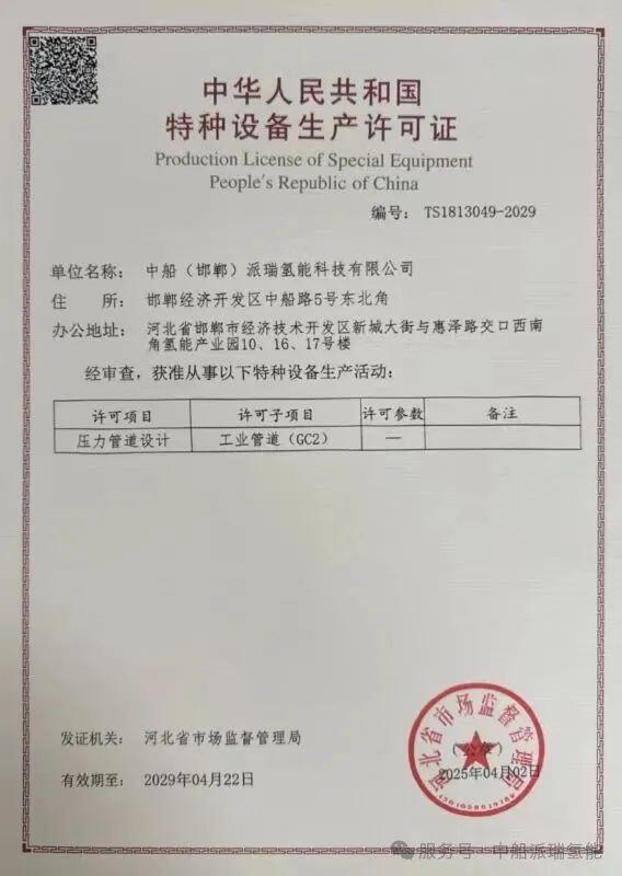 近日,中船集团第七一八研究所旗下中船(邯郸)派瑞氢能公司(简称“派瑞氢能”)顺利通过压力管道安装资质复审,此次压力管道安装复审首次以制氢装备项目为依托完成评审。填补了派瑞氢能制氢装备管道安装方面质量管理体系的空白。