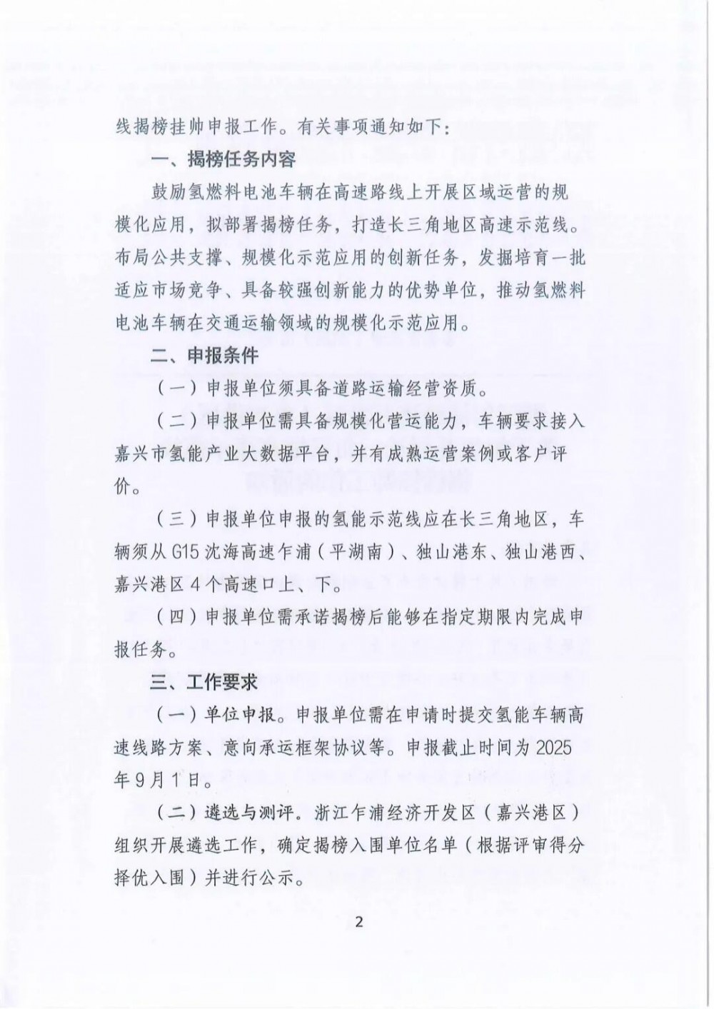 同时,申报单位申报的氢能示范线应在长三角地区,车辆须从G15沈海高速乍浦(平湖南)、独山港东、独山港西、嘉兴港区4个高速口上、下。申报单位需承诺揭榜后能够在指定期限内完成申报任务。