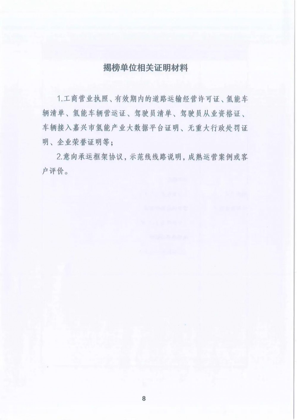 要求申报单位须具备道路运输经营资质。需具备规模化营运能力,车辆要求接入嘉兴市氢能产业大数据平台,并有成熟运营案例或客户评价。