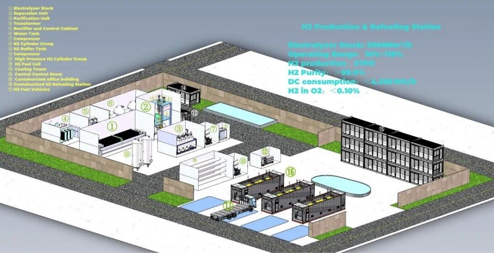(1)风光离网制氢:为应对可再生能源离网制氢场景,中集中电电解槽具备并发布了低负荷运行技术、SSWAC宽频快启控制系统、ESOnline小室电压自动检测模块、HMS热能回收系统等技术。保证电解槽在风光离网制氢场景下,可以快速响应电力波动(荷随源动),快速启动与停机,低负荷运行,故障预测与分析,节能降耗,有效适应离网制氢场景。确保绿氢工厂和电解槽运行安全,延长核心设备使用寿命。