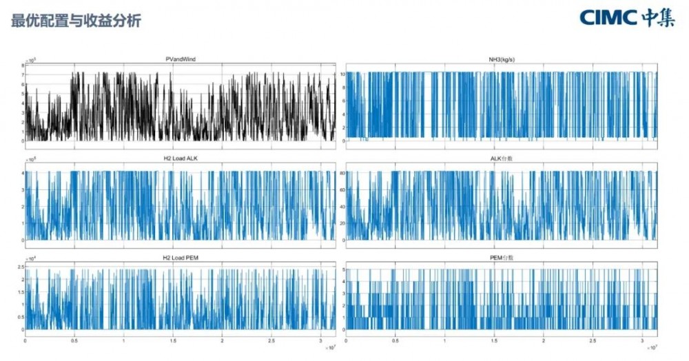 (5)风光制氢合成氨醇:面向主流的风光制氢合成氨醇消纳场景,面向客户对项目收益与收益率的测算需求,中集中电解决方案团队具备从风光出力曲线(8760数据)仿真分析不同电解槽、储氢罐、合成氨醇配置对应的收益、收益率、弃电量、下网电量、设备利用率等的能力,得出最佳收益,为业主做项目FID(项目投资决策)提供重要支持。