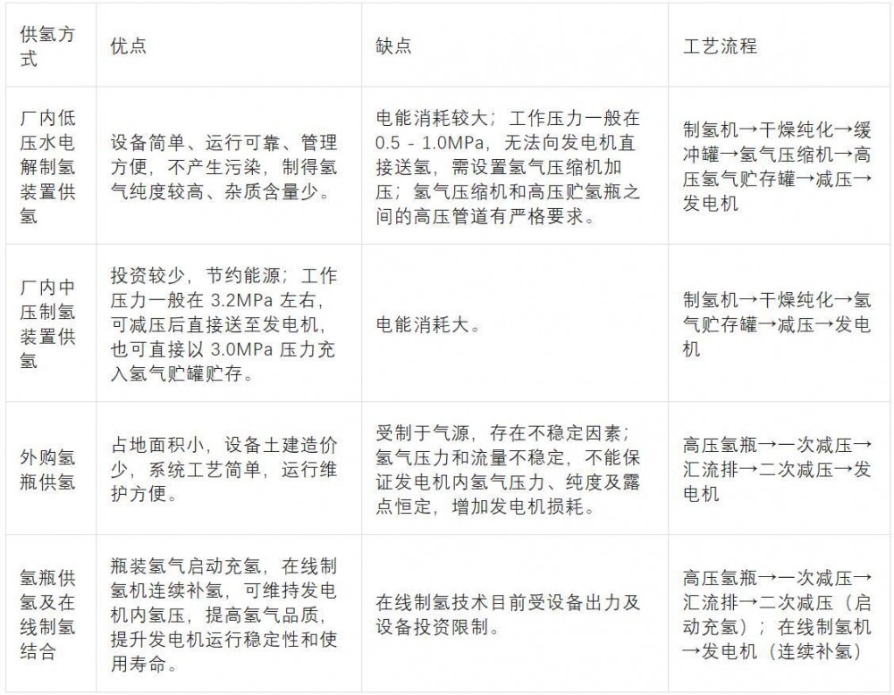 目前电厂内的供氢系统主要有三种:厂内设置水电解制氢装置供氢、外购氢瓶供氢、直接通过管道供氢。此外,还有供氢和制氢相结合的模式,如通过瓶装氢气对发电机进行启动充氢,通过在线制氢机对发电机进行连续补氢。以下为几种常见供氢方式的详细对比: