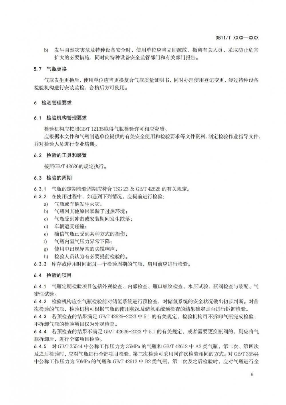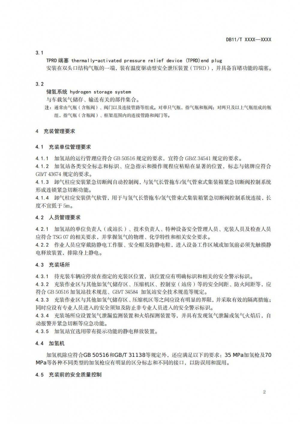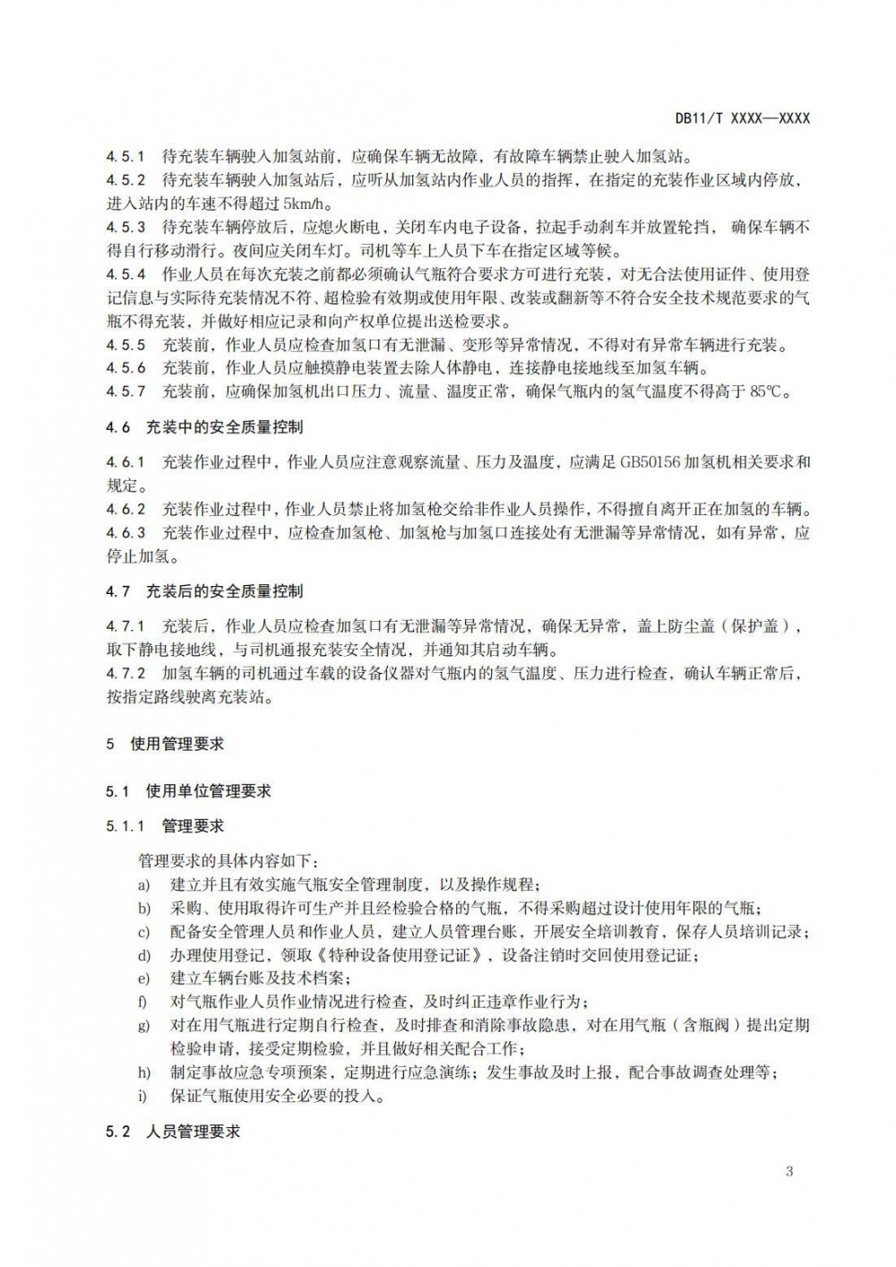 《车用压缩氢气瓶充装、使用与检测管理要求》指出,本文件规定了车用压缩氢气瓶(以下简称“气瓶”)的充装、使用和检验检测的管理要求。